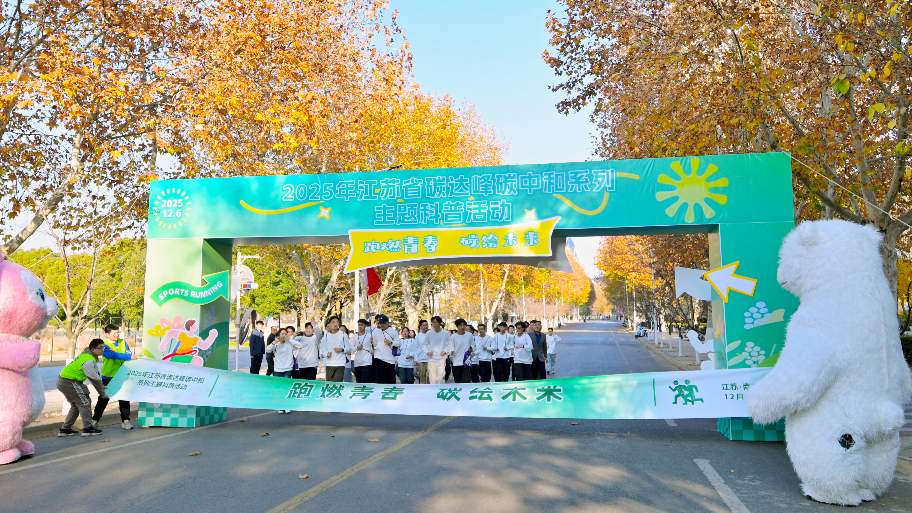 12月6日,以“跑燃青春,碳绘未来”为主题的江苏省碳达峰碳中和系列科普活动在南京信息工程大学举行,省内6所高校师生代表、4 家省级学会代表、环保志愿者及低碳行业从业者齐聚一堂,通过签名承诺、绿色慢跑、科普研学三重形式,让“双碳”理念走进人心。